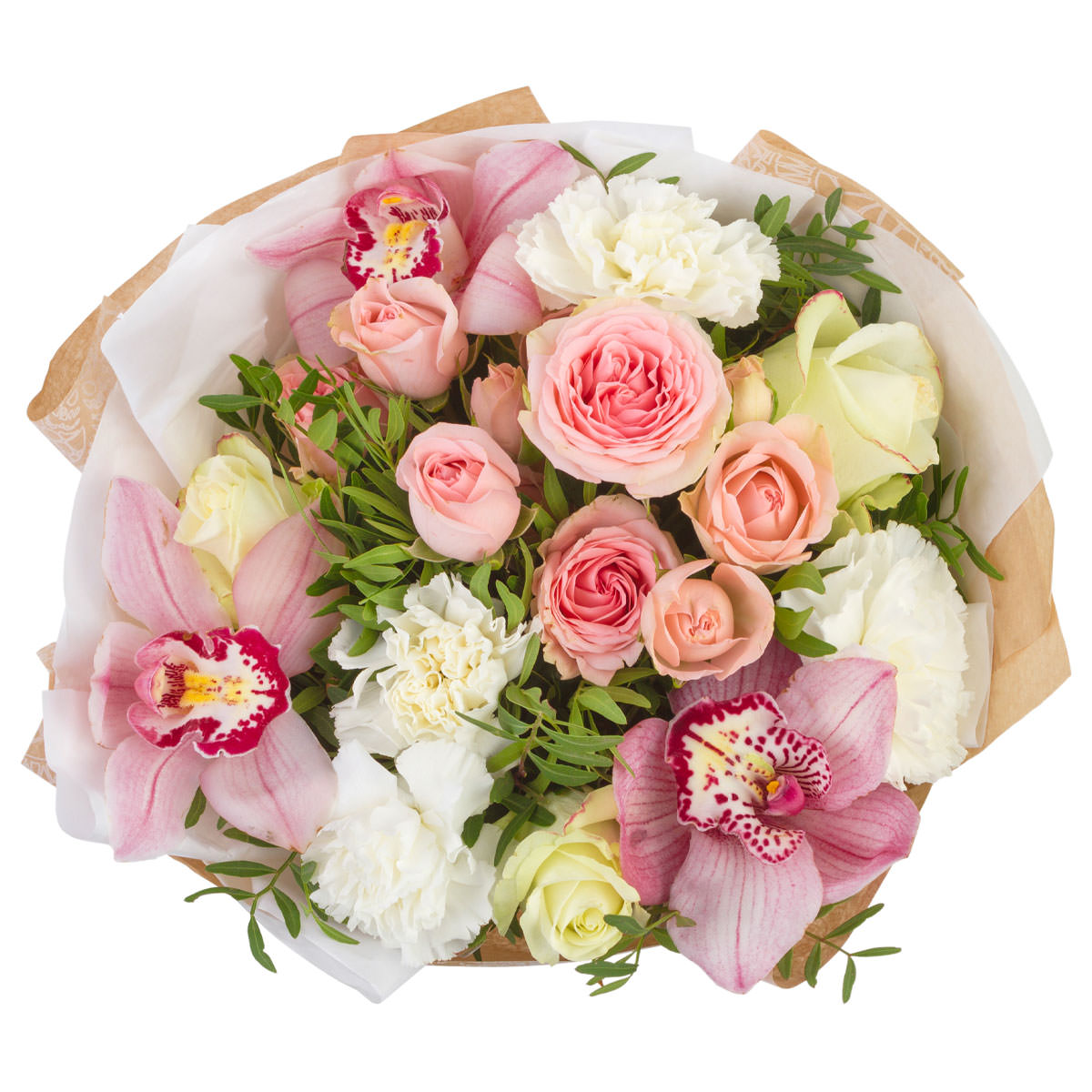 Роза одноголовая розовая и чайная, орхидея розовая, гвоздика белая, фисташка. Упаковка (лента, пленка, крафт, сетка, пленка матовая)