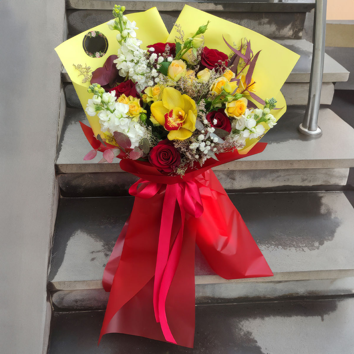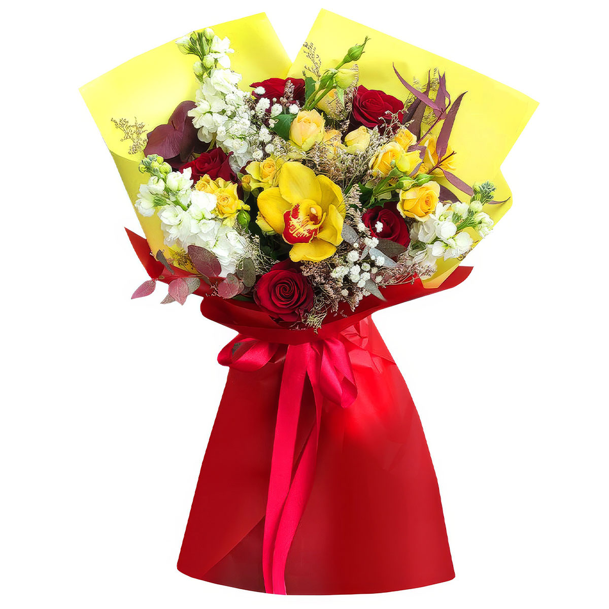 Орхидея желтая, роза одноголовая красная , маттиола белая, роза кустовая желтая, эвкалипт, гипсофила. Упаковка (лента, пленка, крафт, сетка, пленка матовая)