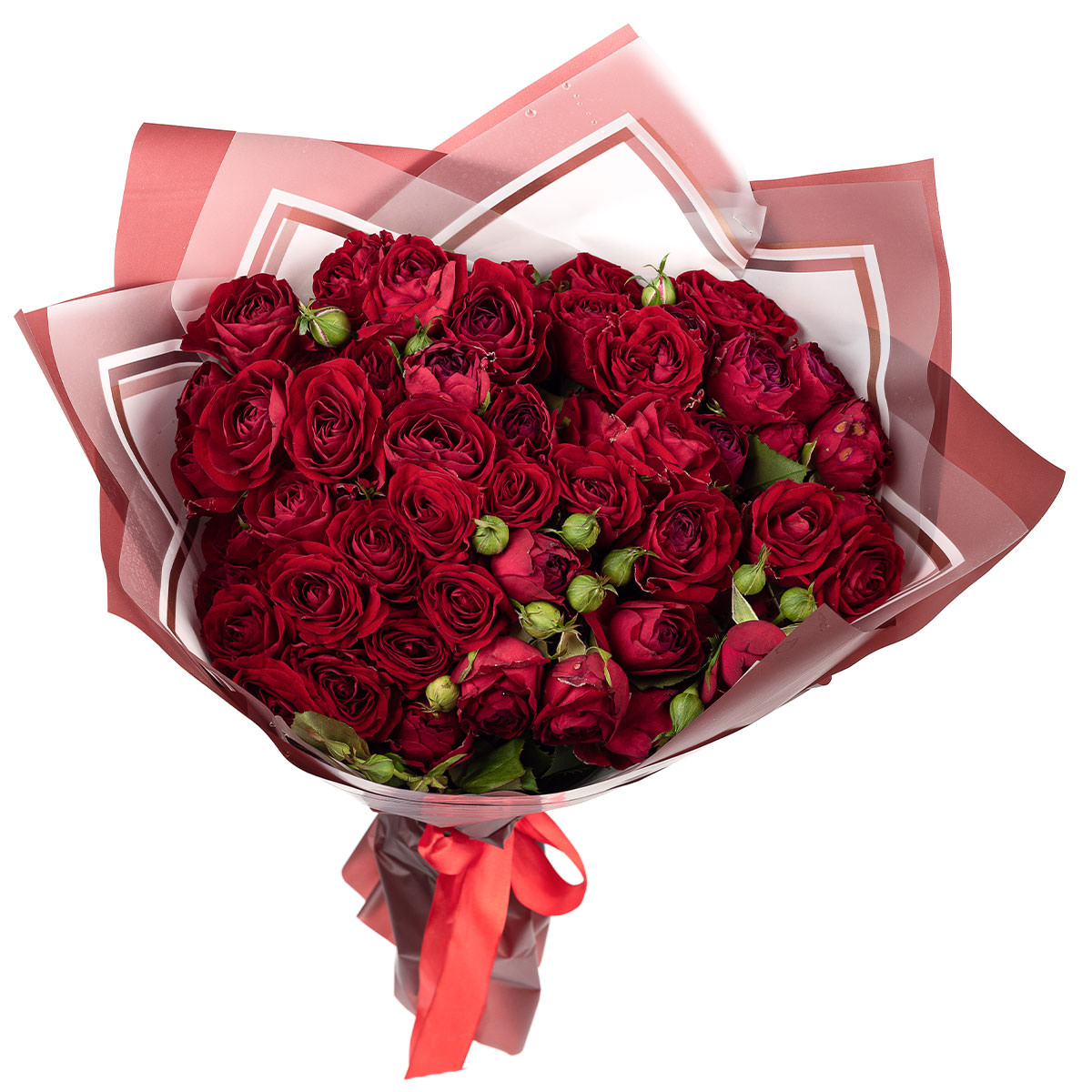 Роза кустовая красная. Упаковка (лента, пленка, крафт, сетка, пленка матовая)